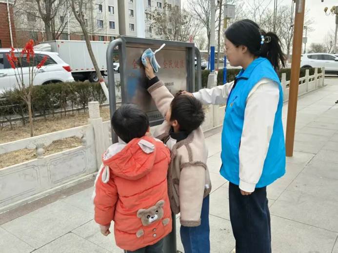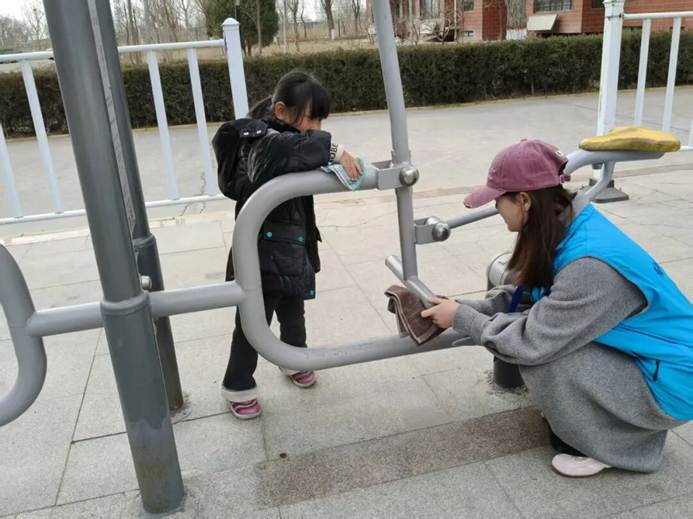 随后的实践环节中,队员带着孩子们来到社区健身区域。大家分成小组,有的拿抹布仔细擦拭健身器材的扶手和座椅,有的用小刷子清理器材缝隙里的灰尘,还有的主动帮忙整理散落的健身垫。队员们手把手教孩子们正确的擦拭方法,提醒他们注意安全。孩子们认真擦拭的模样,成为春日里一道温暖的风景线。